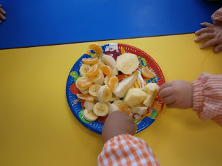 Algunos niños de clase nos quedamos a comer en el cole...Las profes nos lavan las manitas, nos ponen los baberos, y hacemos un tren.